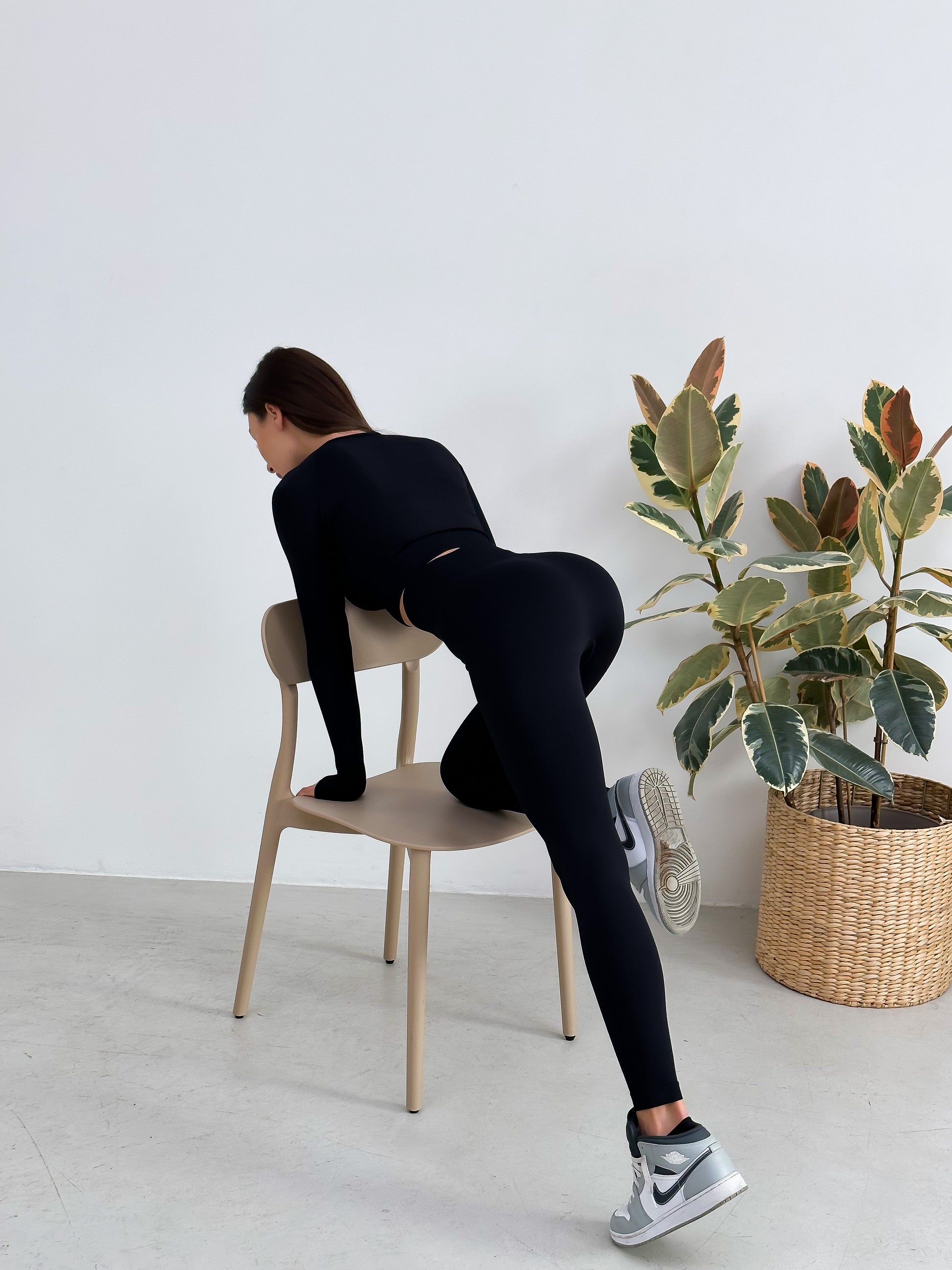 Szeroki pas w legginsach i rashguardzie z gęstego materiału modeluje sylwetkę