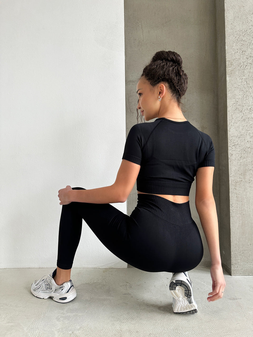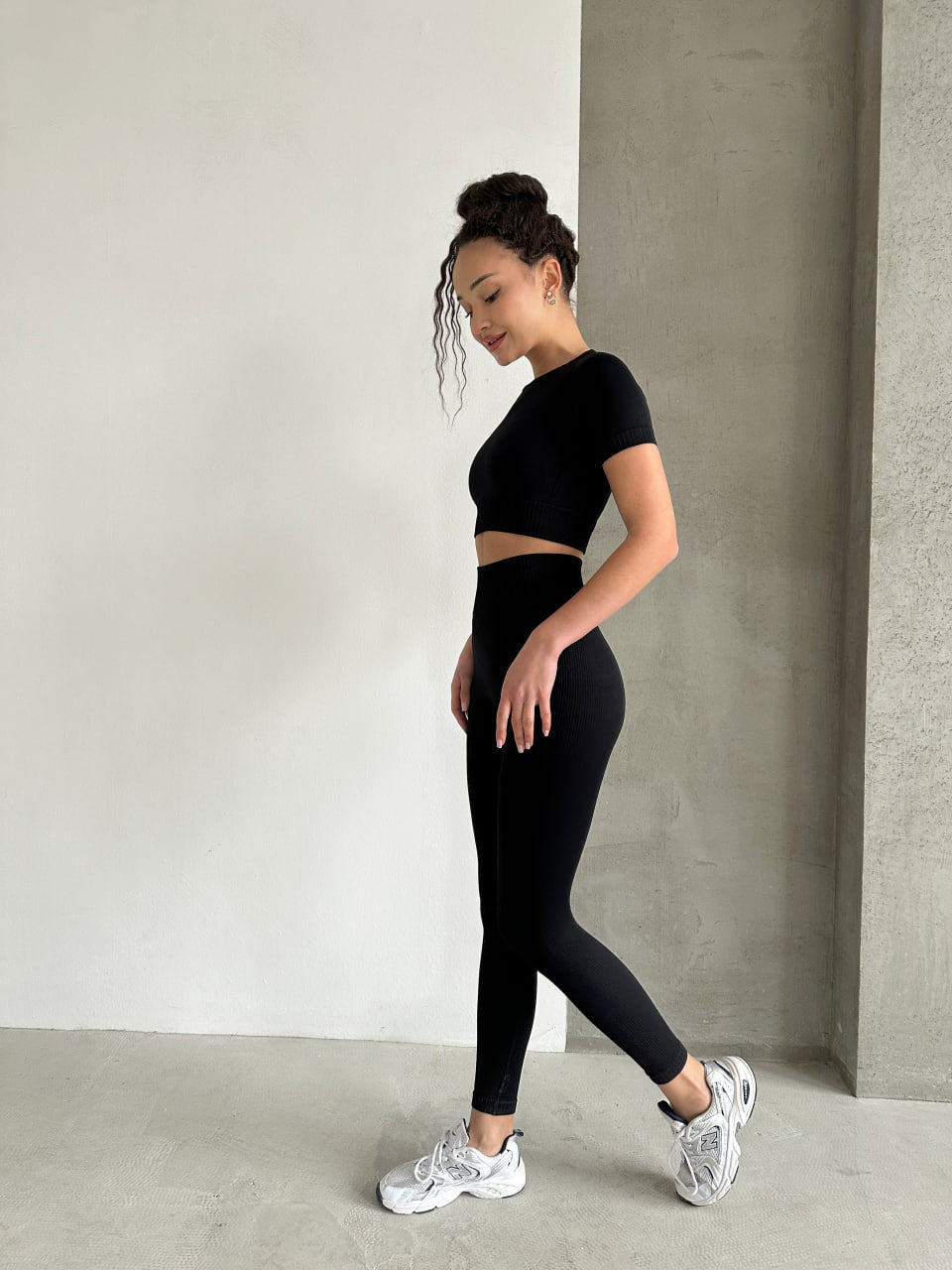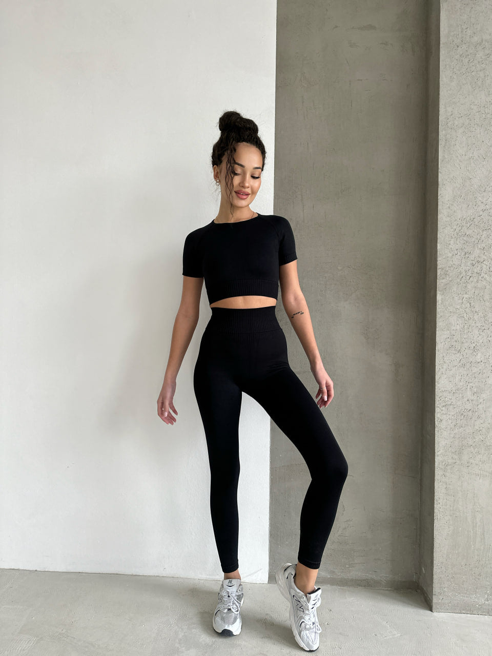 ⁃ Legginsy z szerokim paskiem optycznie zwężającym talię;