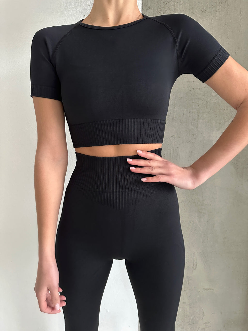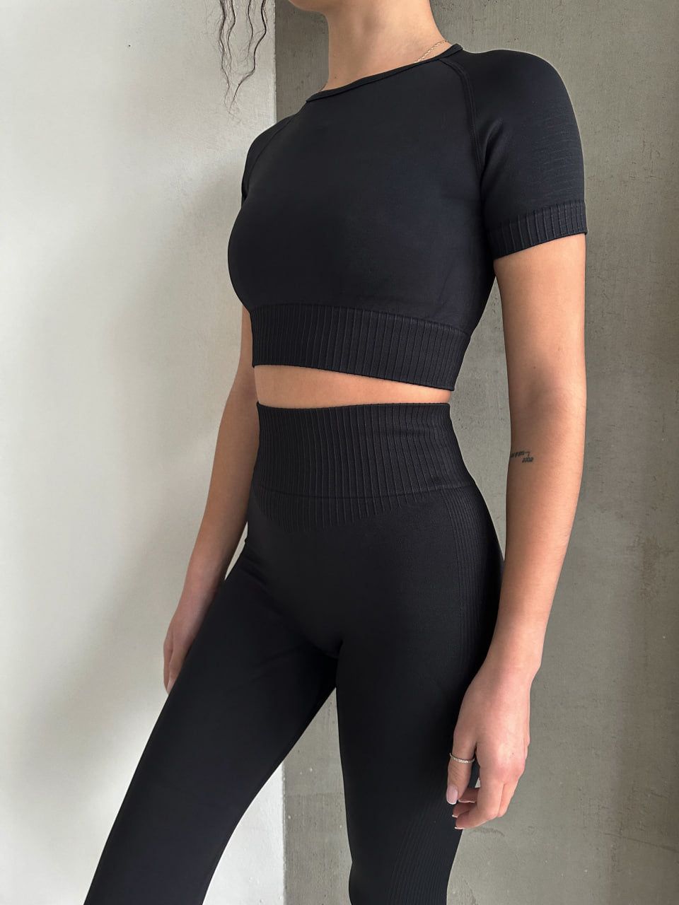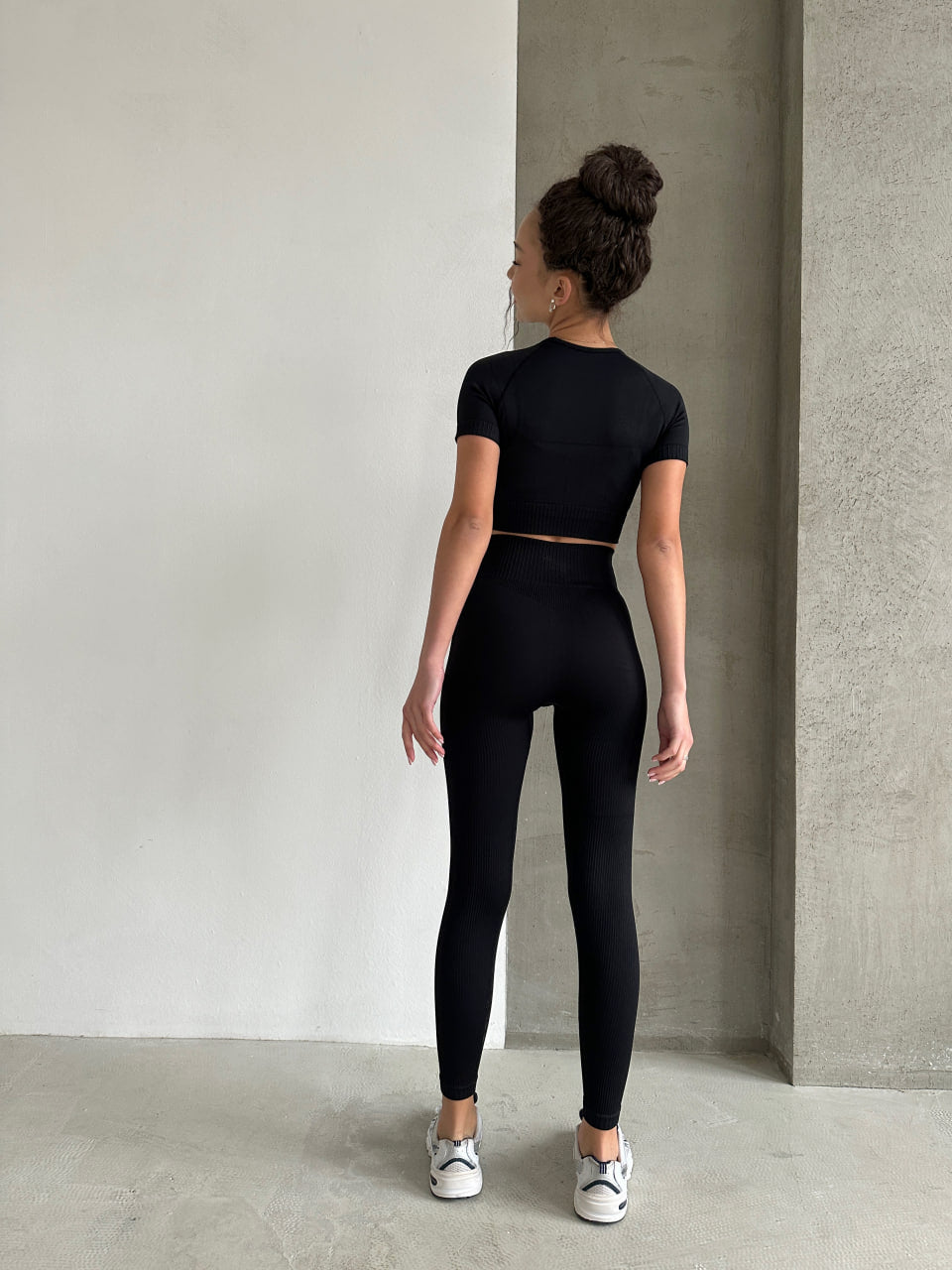 ⁃ Legginsy z szerokim paskiem optycznie zwężającym talię;