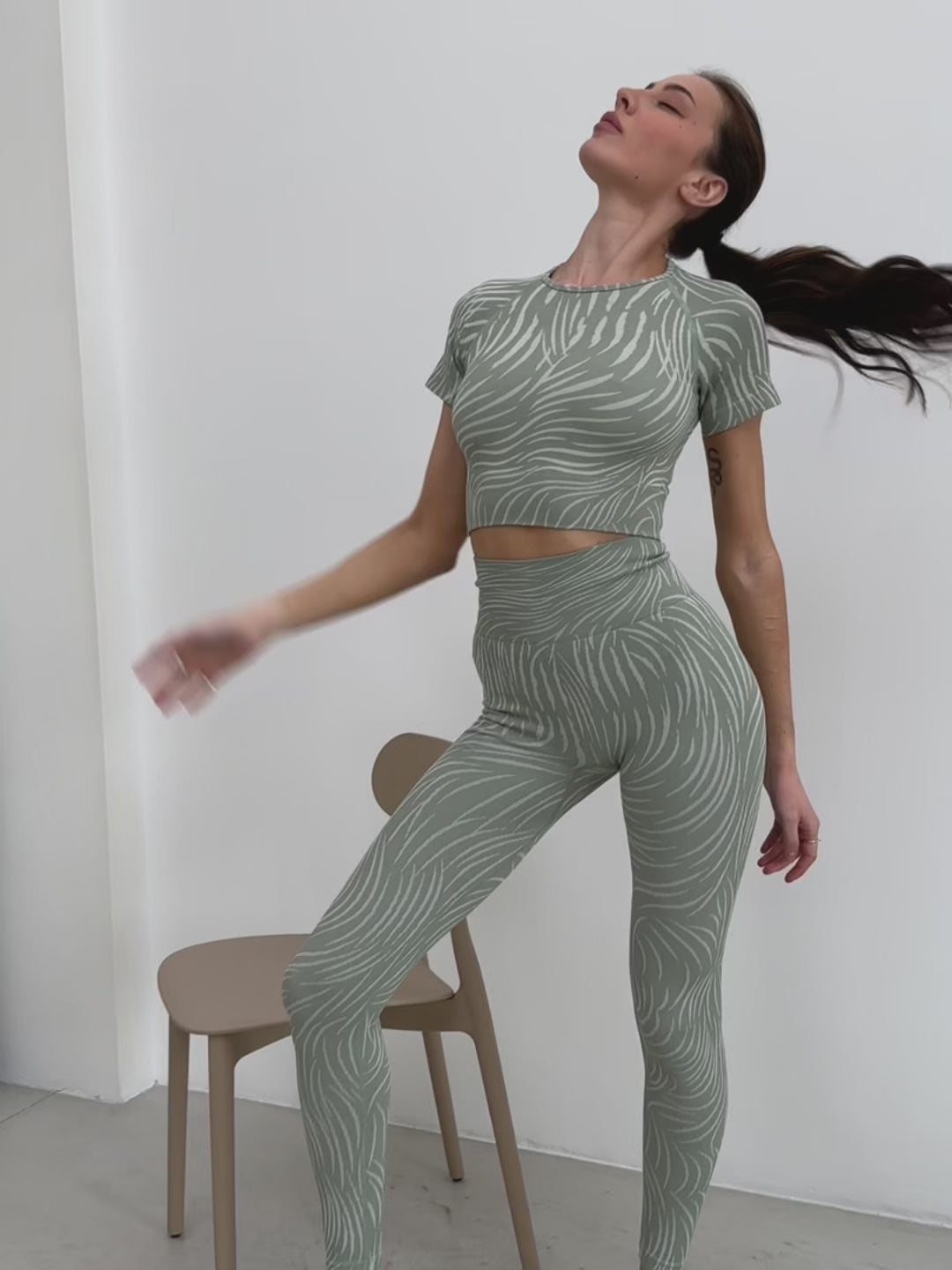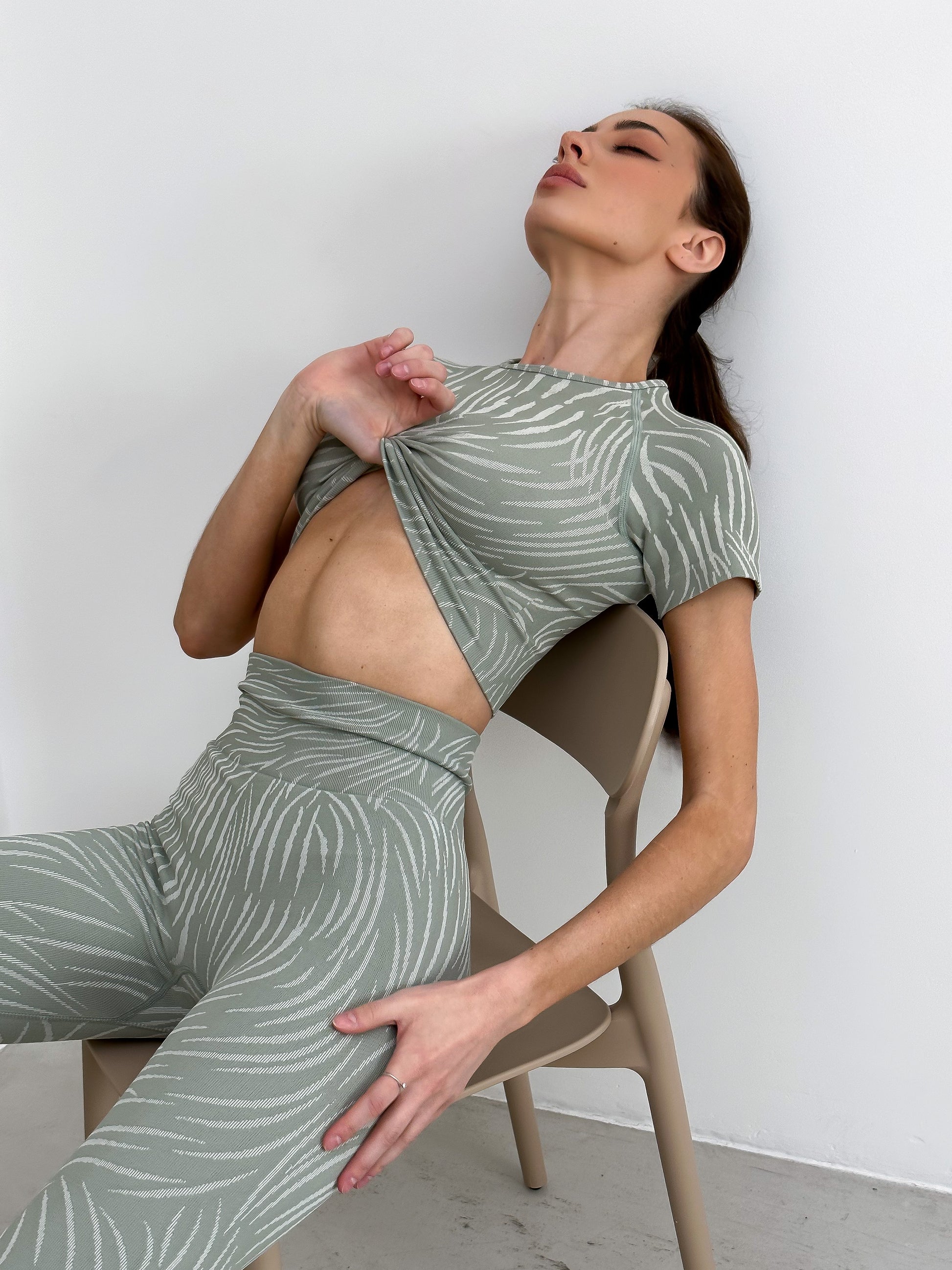 Szeroki pas w legginsach z gęstego materiału modeluje sylwetkę